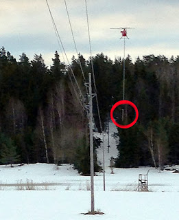 Här skrev jag tidigare om detta med strömavbrotten. Här kan ni se samma helikopter (?) på bild i Sollefteå där de röjde ledningsgator innan snön föll för snart fyra år sedan. Men på Värmdö skulle det väl aldrig mer snöa så här var det inte någon idé att röja.
